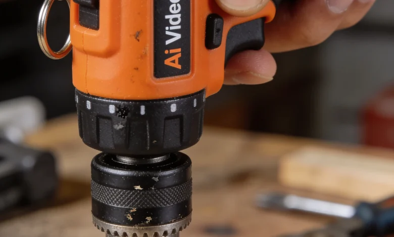 Input: you need create image first (use grok for best result) Ultra-realistic macro product photography of a miniature professional cordless drill driver, keychain-sized but fully functional industrial design, orange and black matte plastic body with metallic chuck and steel drill bit, realistic brand label [Ai video Sikho ] printed on the side, ergonomic rubber grip textures preserved exactly like a real power drill, held between thumb and fingers of a human hand to clearly show tiny scale, drill bit actively drilling into a wooden plank placed on a scratched wooden workbench, natural wood dust and fine shavings around the hole, blurred workshop background with scattered real tools, cinematic workshop lighting, shallow depth of field, hyper-detailed textures, visible wood fibers spiraling out from the drilled hole, realistic wear marks and micro scratches on metal chuck, professional industrial realism, photorealistic 8K detail