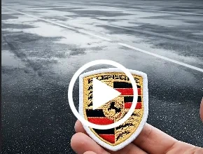 Input-First-person POV tossing a Porsche patch on wet asphalt. The patch hits the ground and becomes a solid black tire.…